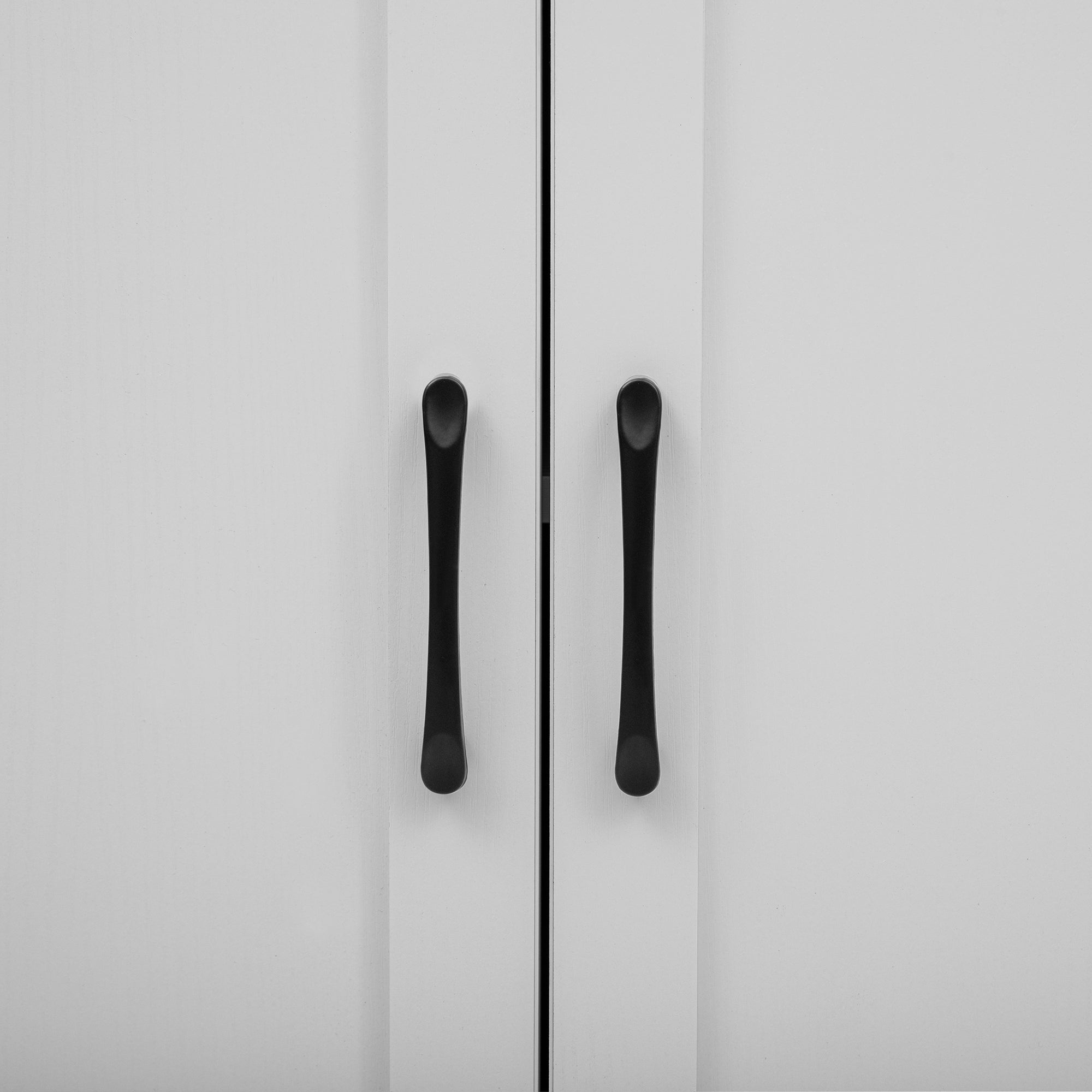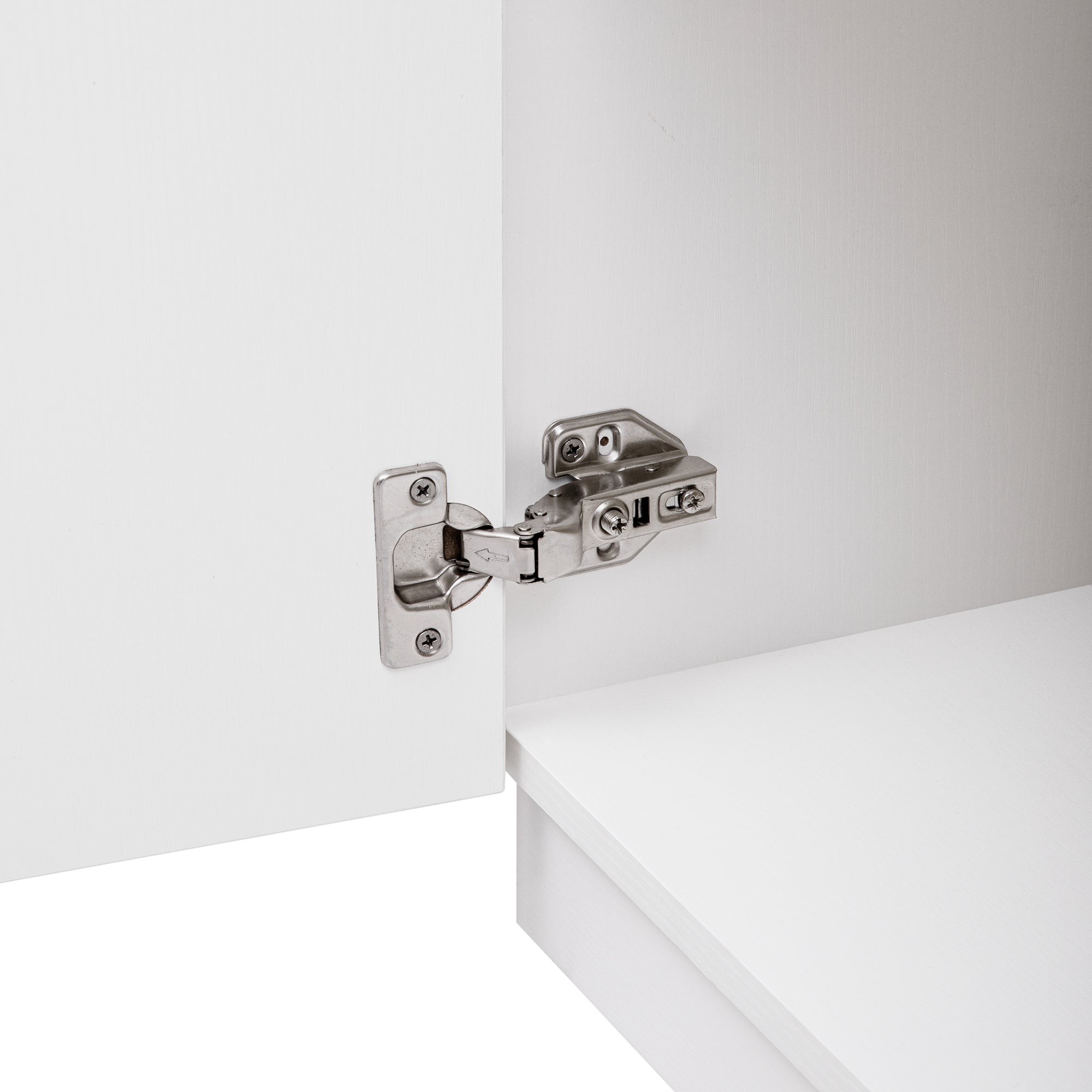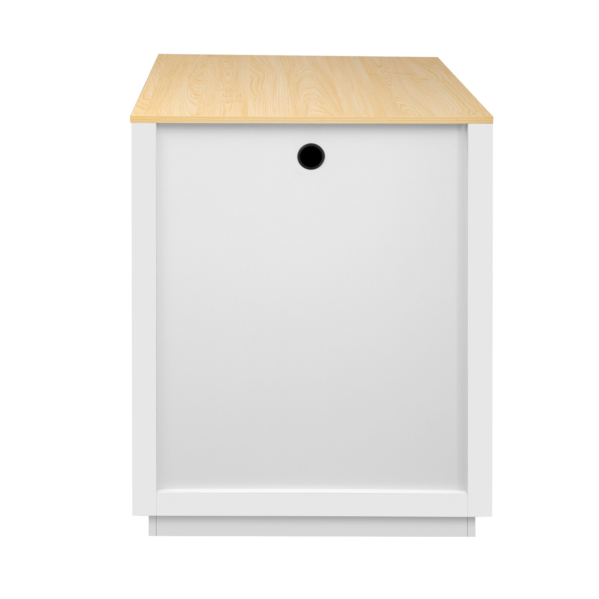 - Materials: P2 MDF with melamine veneer; two-tone white cabinet with natural wood grain top