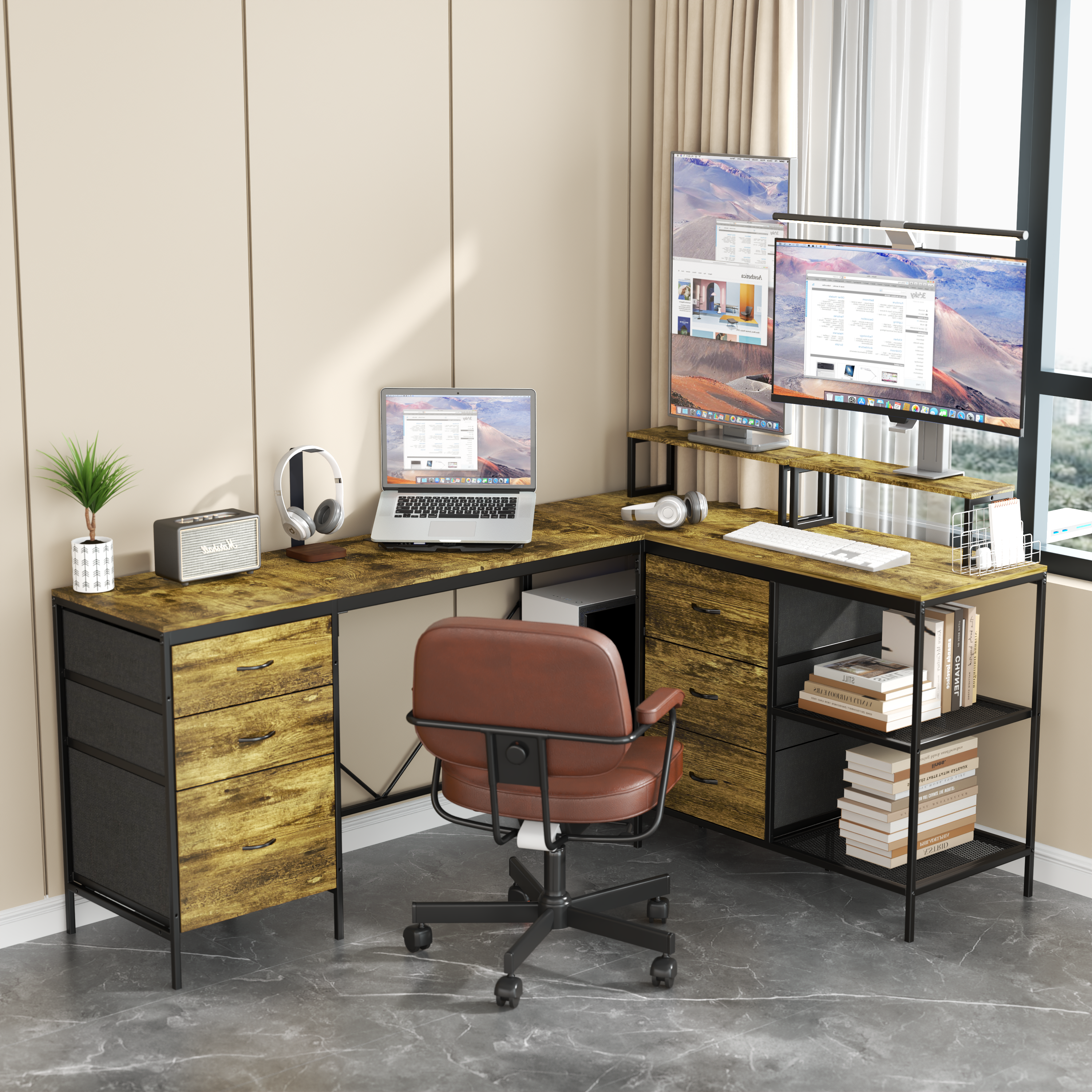 Key features include adjustable monitor risers, six fabric drawers, three open shelves, and flexible L-shape or straight configurations to fit your room.