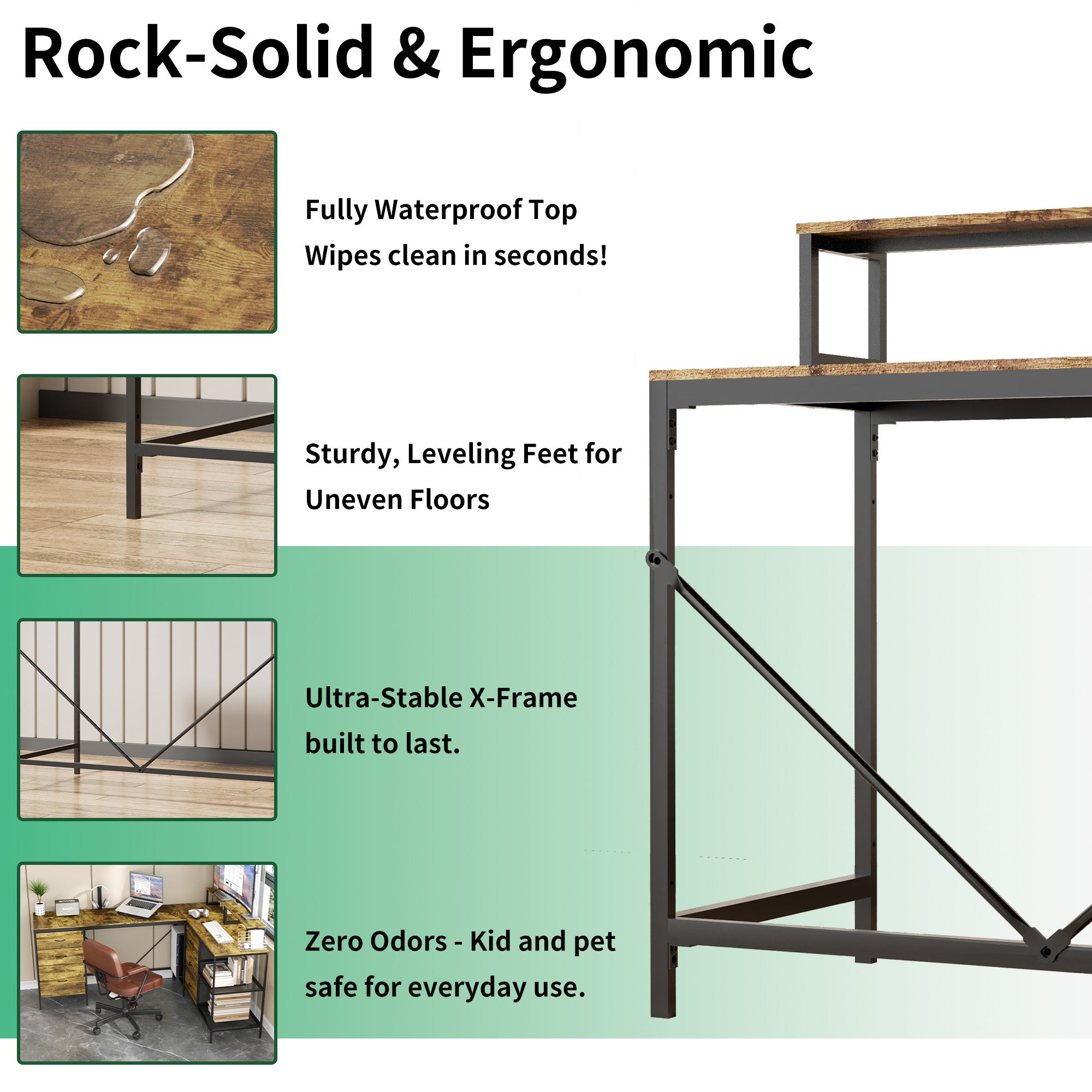 SEO keywords: L-shaped desk, corner desk, industrial computer desk, built-in power hub, USB-C, movable monitor stands, fabric drawers, 114-inch desk, rustic brown finish, home office furniture, gaming desk.