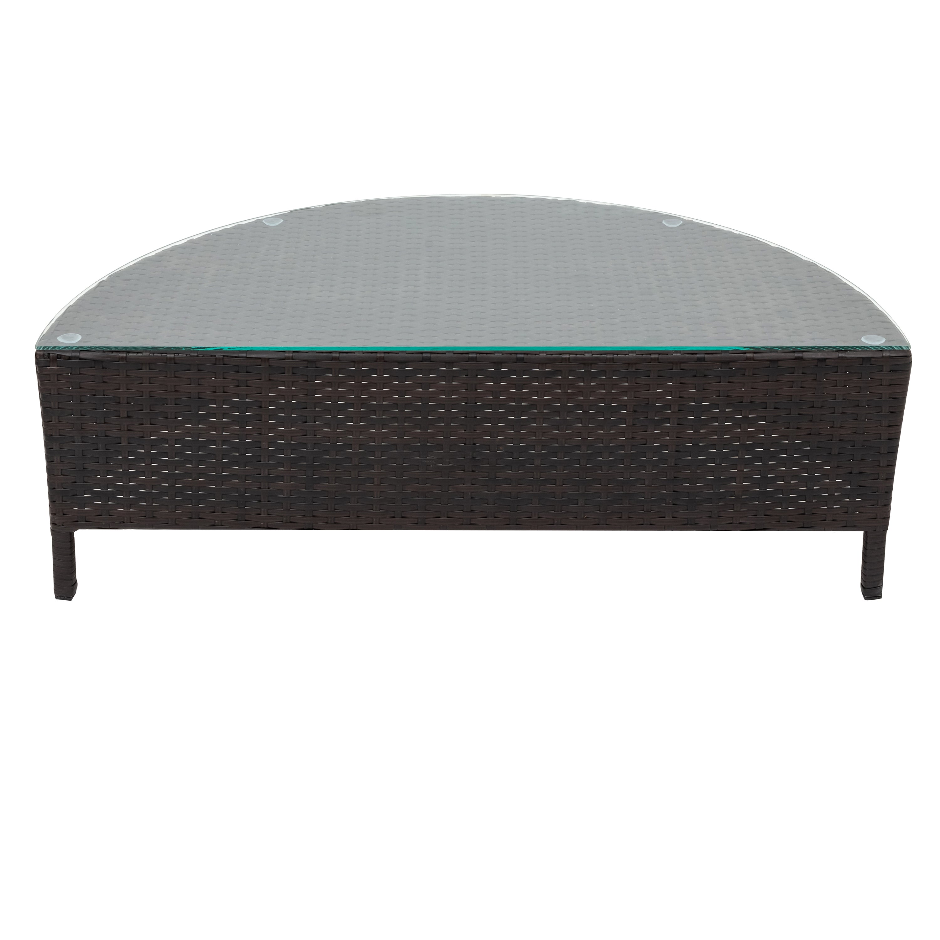 This complete patio set includes four 2‑person sofas, a half‑moon tempered glass top table, and eight thick pillows plus four cushions for cloud‑soft comfort and stylish lounging.