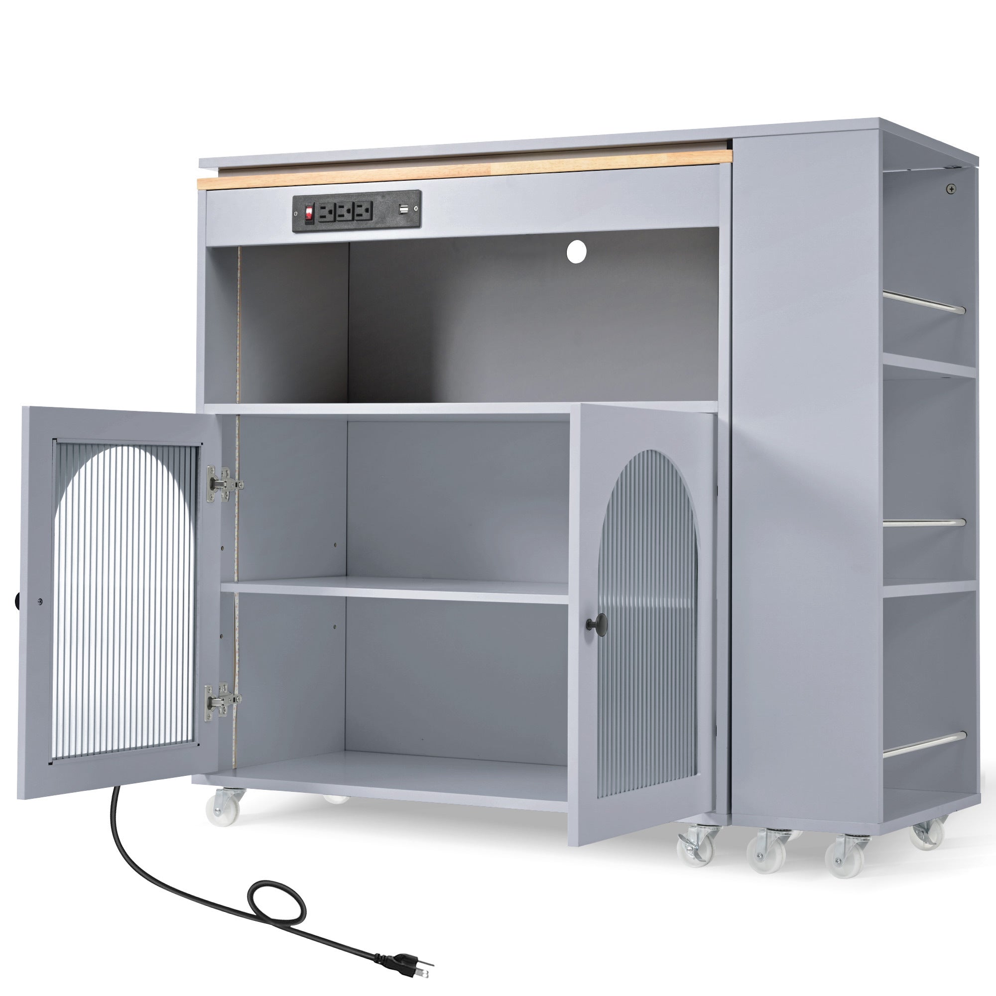 AIhouse Rolling Kitchen Island with Extendable Table, LED Lights, Power Outlets, Fluted Glass Doors, Grey, 40-55in Wide
